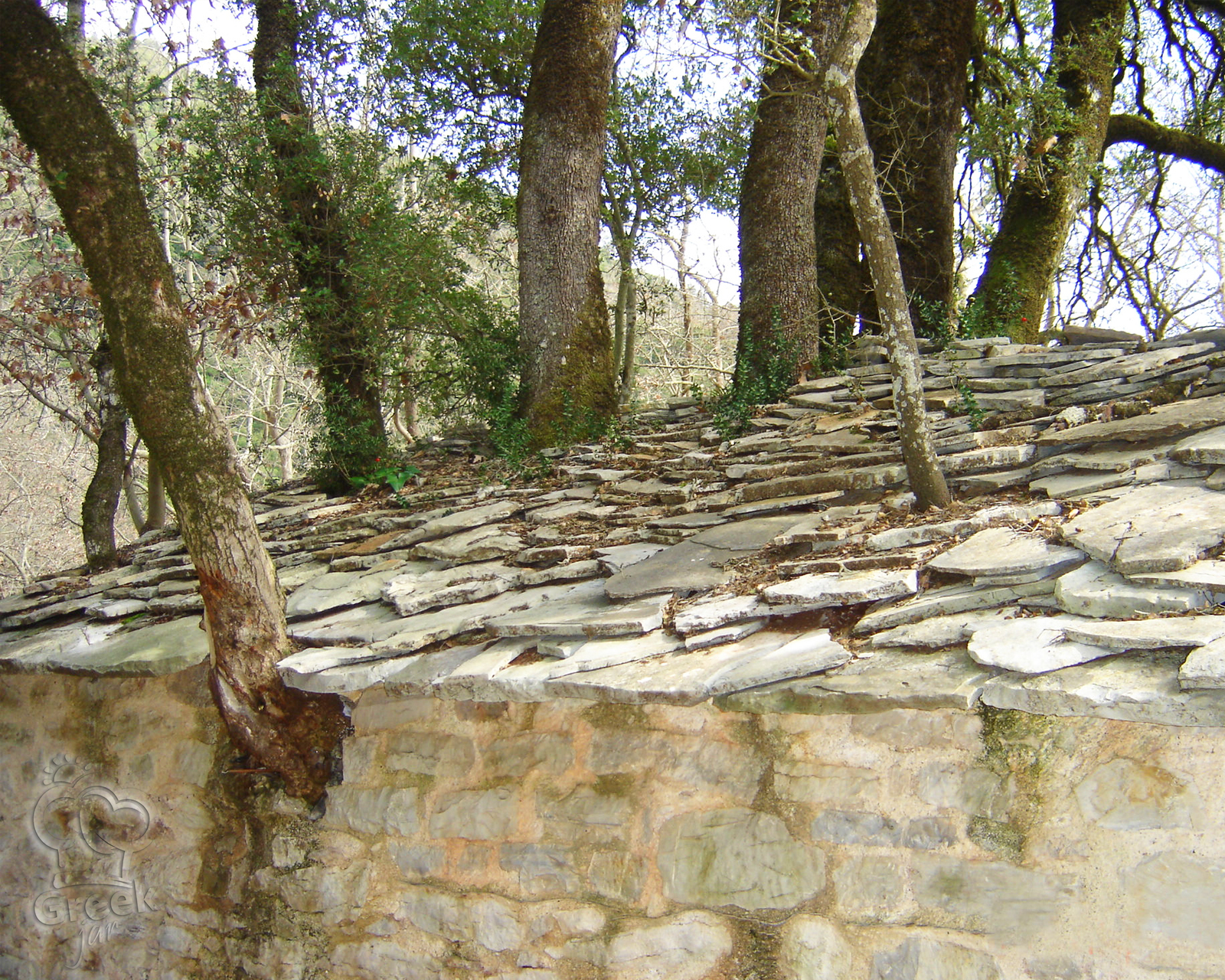 Πλησιάζοντας την εκκλησία, αμέσως εντυπωσιάζεται κανείς από το μοναδικό θέαμα των δεκαεπτά δέντρων που φαινομενικά ξεφυτρώνουν από τη στέγη της, με τα κλαδιά τους να φτάνουν προς τον ουρανό σε μια μαγευτική επίδειξη της ανθεκτικότητας της φύσης. Πώς θα μπορούσε η ομορφιά αυτή να συμπλέκεται τόσο άψογα με την ιερότητα αυτού του μικρού χώρου; Με μια πιο προσεκτική εξέταση, αποκαλύπτεται το μυστικό αυτού του θαύματος : οι ρίζες αυτών των δέντρων περνούν μέσα από τους πέτρινους τοίχους της εκκλησίας και φθάνουν κάτω, στο εύφορο έδαφος. Πρόκειται για μια απόδειξη της αρμονικής συνύπαρξης ανθρώπου και φύσης, μια σκηνή που μοιάζει σχεδόν εξωπραγματική αλλά και βαθιά ριζωμένη με την πίστη και την ιστορία.